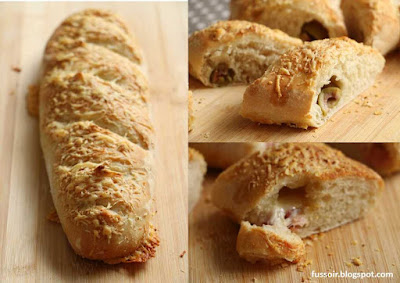 Mis les ingrédients dans l'ordre levure émiettée, farine, eau, huile, sel. Pétri avec le programme pâte seule de la machine à pain puis laissé reposer pendant 2h, façonné en 4 pâtons puis étalé comme sur les photos, farci deux aux olives ou deux au comté et aux lardons cuits.
